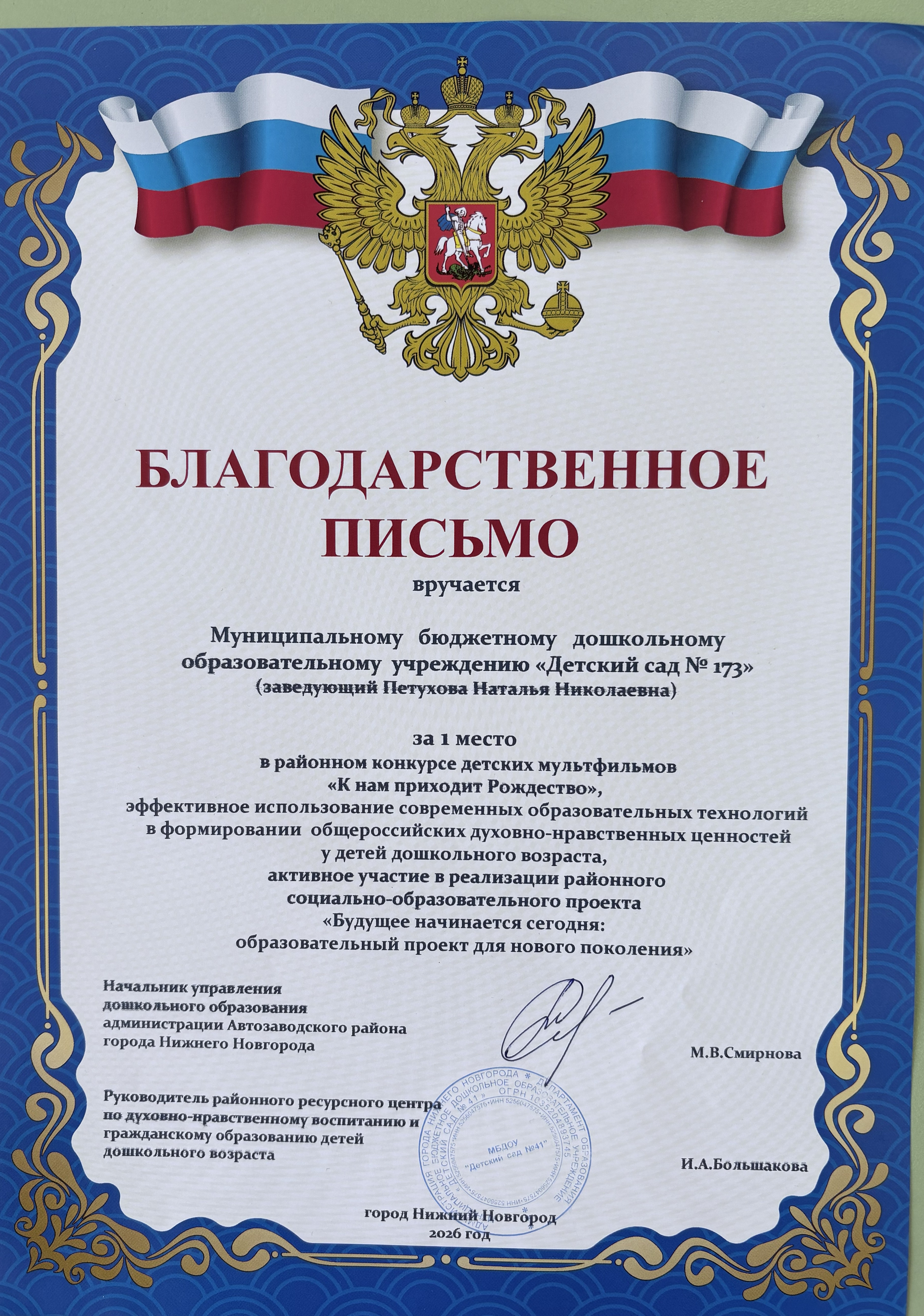 МБДОУ № 115 является победителем конкурсного отбора МДОУ Нижегородской области, реализующих основную общеобразовательную программу дошкольного образования в рамках реализации приоритетного национального проекта "Образование" в 2012 году (Грант губернатора)
